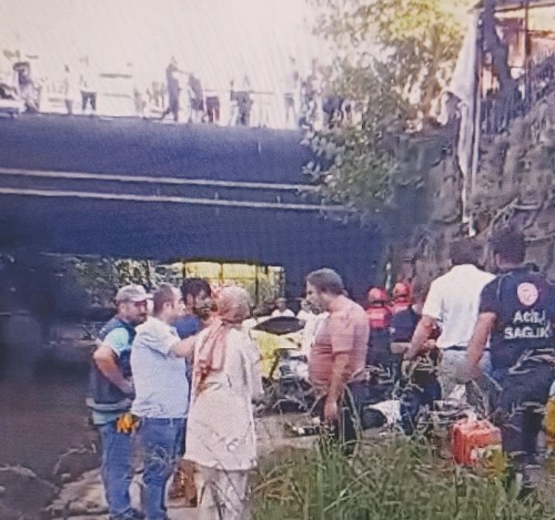 İddiaya göre; plakası alınamayan tır, 67 T 5052 plakalı ticari taksiye çarptı, taksi de çarpmanın şiddetiyle kaldırımdaki yayalara çarparak dereye düştü.