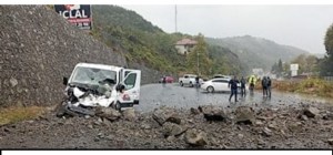 Kdz.Ereğli Göktepe mevkiinde meydana gelen trafik kazasında, özel bir firmaya ait 67 LB 903 plakalı kamyonetin sürücüsü İlker Koçdemir, aracını park alanında kamyonlara yakıt ikmali yaparken yamaçtan kopan kaya parçalarının kamyonetin kaput kısmına isabet etmesi sonucu arac kullanılamaz hale geldi.
