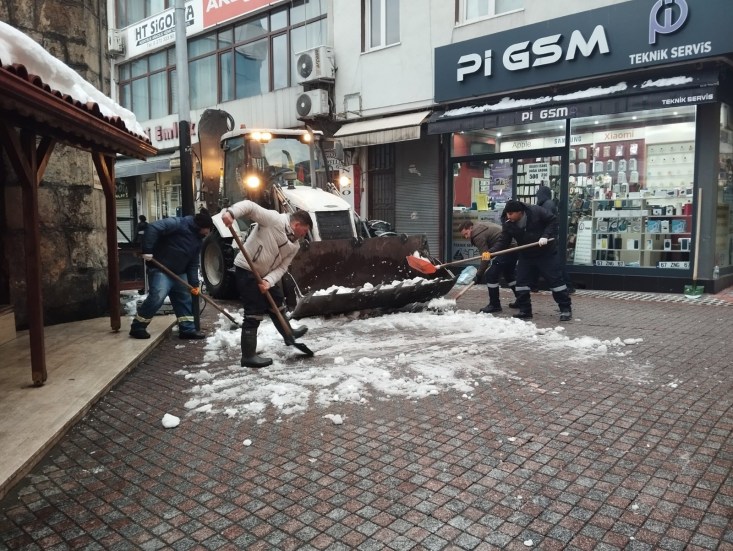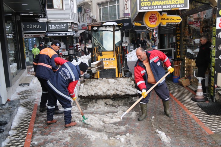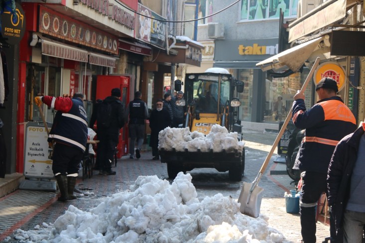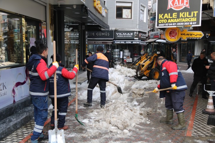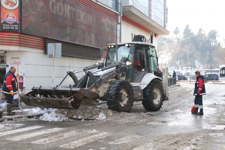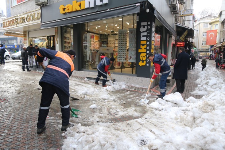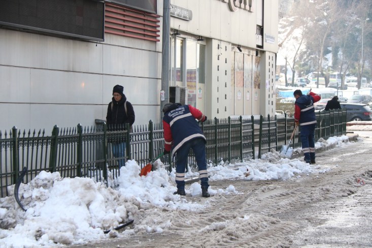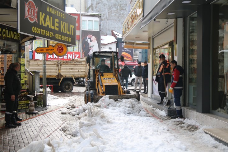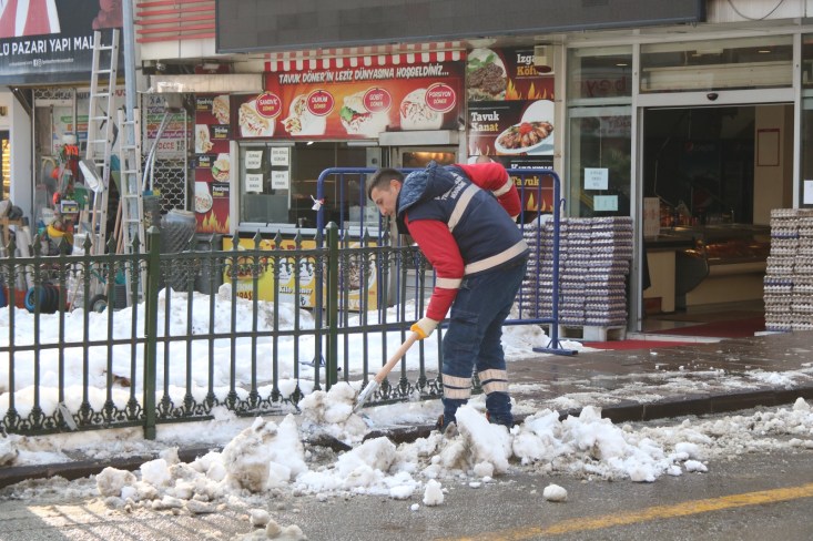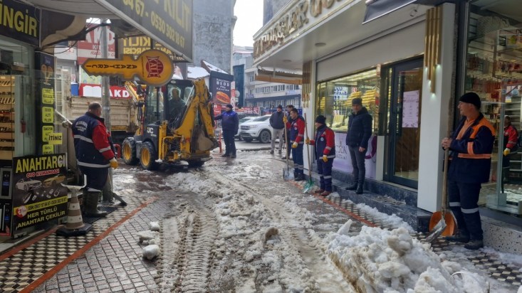 Temizlik İşleri, Fen İşleri ve Su Kanalizasyon İşleri Müdürlüğü ekipleri ellerinde küreklerle kaldırım ve yaya yollarını temizliyor. İş makineleri kentin 600 kilometrelik yol ağında temizlik çalışmalarına devam ediyor.