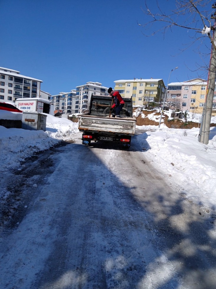Kdz. Ereğli Belediyesi, karla mücadele seferberliğini sürdürüyor. Ana arterlerden sonra ara yollarda kar küreme ve tuzlama çalışmaları devam ediyor, kaldırımlar ve yaya geçitleri yayalar için güvenli hale getiriliyor. İtfaiye tehlike arz eden kar ve buz sarkıtlarını temizliyor, çarşı merkezi kar kütlesinden arındırılıyor.