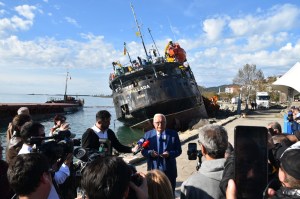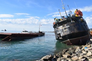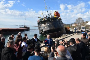Sahilde gördüğünüz gemi kayaları parçalayarak karaya vurmuş durumda. Bundan da endişe ediyoruz daha önce bir gemi karaya vurmuş ve 3-5 sene beklemiştik, kaldırılmasını. Yine askeri liman çevresinde bir gemi battığı belli oldu. Mürettebatın araması devam ediyor. Helikopterle sahil güvenlik aramalara devam ediyor.