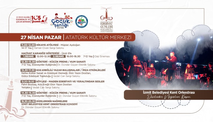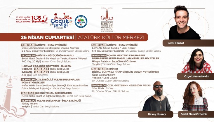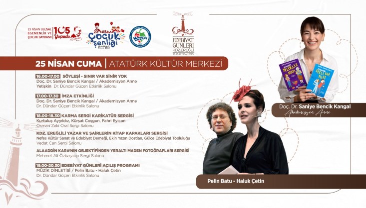 25-26-27 Nisan tarihlerinde ise Atatürk Kültür Merkezi salonlarında hazırlanan “Kdz. Ereğli Edebiyat Günleri” programında, edebiyat temalı sergiler, atölyeler, seminerler, söyleşiler, yazar buluşmaları, imza etkinlikleri, film gösterimleri ve müzik dinletileri gerçekleşecek.