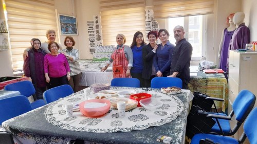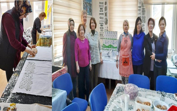 Kurs öğretmeni Emine Altıntaş ve kursiyerleri, depremde zarar gören ailelerin yaralarına bir nebzede olsa merhem olmak ve hayatlarına biraz renk katmak amacıyla yastık kılıfları ve masa örtüleri yaptılar.