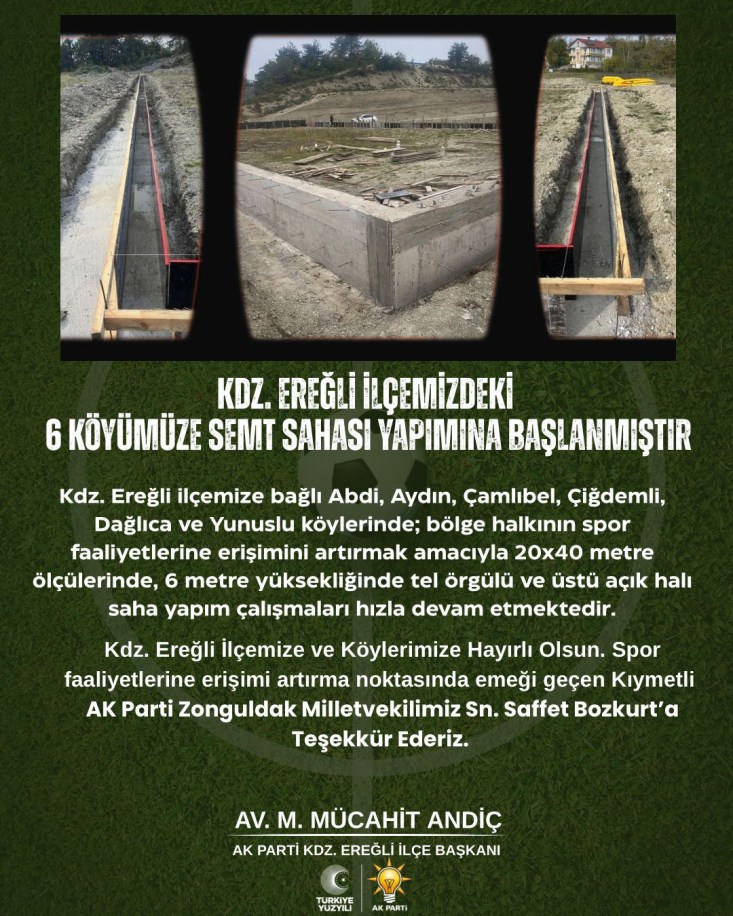 Karadeniz Ereğli ilçemizdeki 6 köyümüze semt sahası yapımına başlandığı müjdesini verdi.