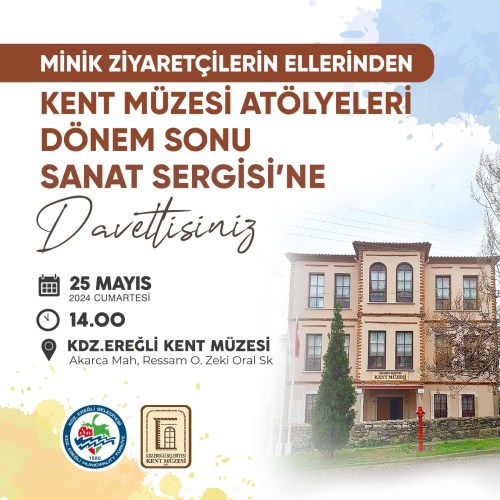 Minik ziyaretçilerin ellerinden, Kent Müzesi Atölyeleri Dönem Sonu Sanat Sergisi 25 Mayıs Cumartesi günü saat 14.00’de Kdz. Ereğli Belediyesi Kent Müzesi’nde açılacak, sergi bir hafta boyunca saat 10.00 - 17.00 arası ziyaretçilere açık olacak.