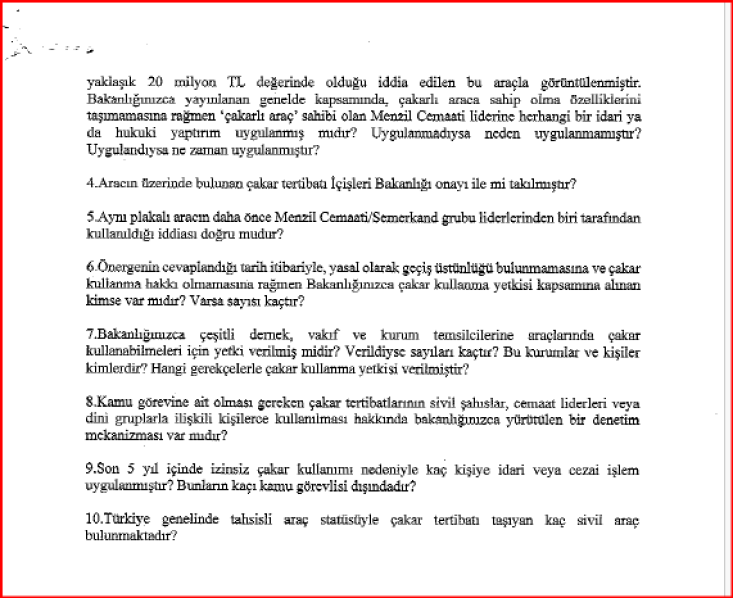Milletvekili ERTUĞRUL, bugün basına düşen, Beşiktaş’ta bir motokurye ile lüks çakarlı araç sürücüsünün tartışması sonucu aracın Menzil şeyhi Muhammed Fettah’a ait olduğunun belirlenmesi üzerine soru önergesi verdi ve konuyu mecliste de gündeme getirdi.
