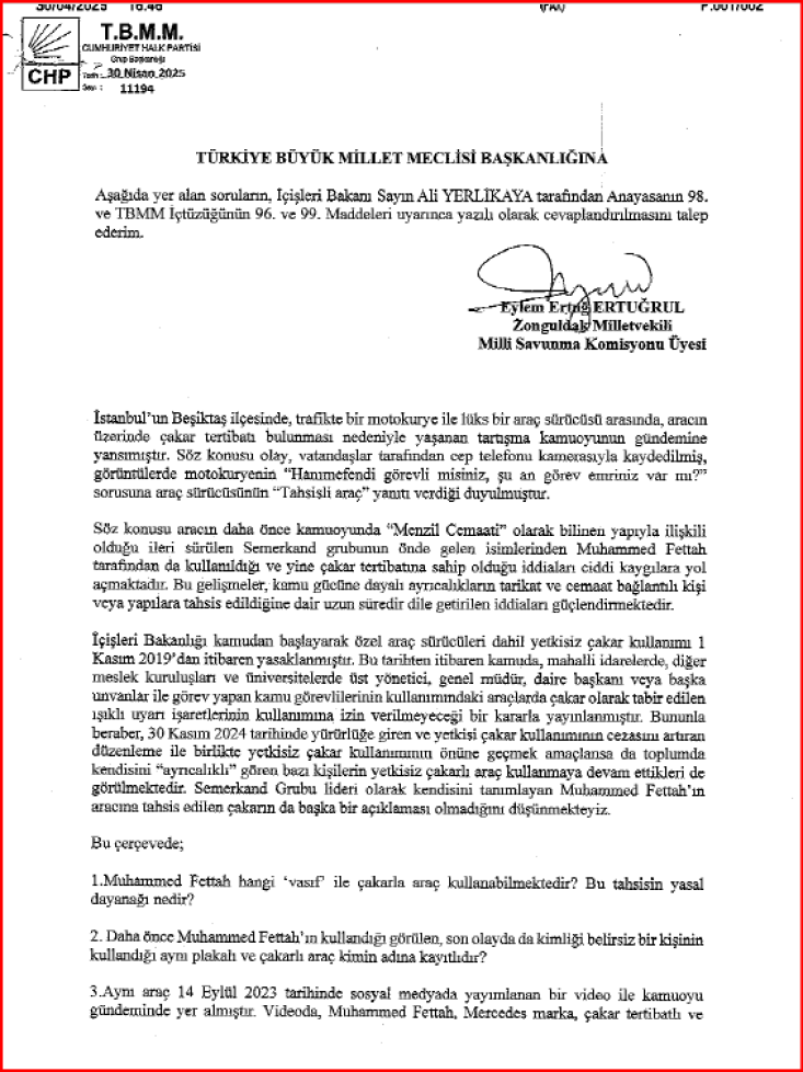 CHP Zonguldak Milletvekili TBMM Milli Savunma Komisyonu Üyesi Eylem ERTUĞRUL, bugün basına düşen, Beşiktaş’ta bir motokurye ile lüks çakarlı araç sürücüsünün tartışması sonucu aracın Menzil şeyhi Muhammed Fettah’a ait olduğunun belirlenmesi üzerine soru önergesi verdi ve konuyu mecliste de gündeme getirdi.