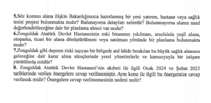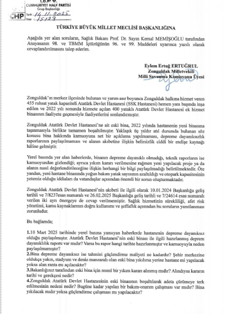 Ertuğrul, Zonguldak’ın merkezinde yarım asırdan fazla bir süre vatandaşlarımıza hizmet veren 455 yatak kapasiteli Atatürk Devlet Hastanesi, 2022 yılı sonunda yeni hizmet binasının açılmasıyla birlikte tamamen boşaltıldığını ancak üç yıla yakın bir süredir şehrin merkezindeki bu hastane binasının atıl durumda bırakıldığını, binanın depreme dayanıklılığına dair raporların kamuoyundan gizlendiğini, alanın geleceğine ilişkin herhangi bir resmî açıklama yapılmadığını aktardı.