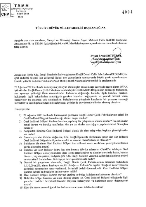 CHP Zonguldak Milletvekili Eylem ERTUĞRUL, ERDEMİR’in Cumhurbaşkanlığı kararnamesi ile özel endüstri bölgesi ilan edilmesine tepki gösterdi.