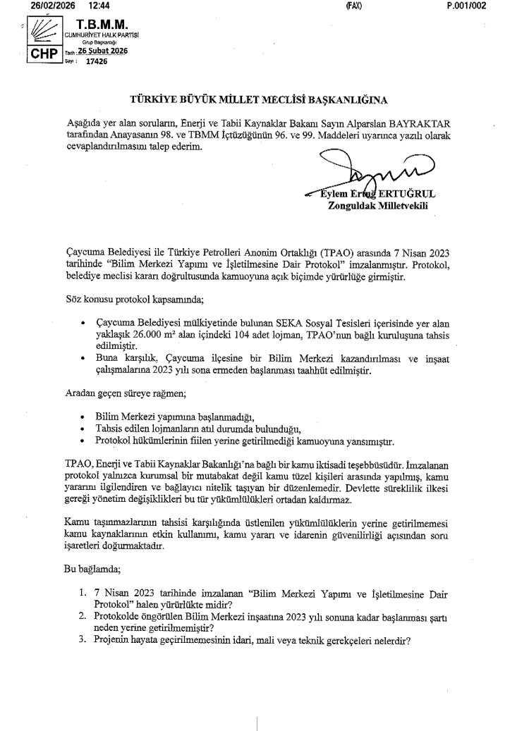 CHP’li Ertuğrul, Enerji ve Tabii Kaynaklar Bakanı Alparslan Bayraktar’ın yazılı olarak yanıtlaması istemiyle verdiği soru önergesinde, protokol kapsamında Çaycuma Belediyesi’ne ait SEKA Sosyal Tesisleri içerisindeki yaklaşık 26 bin metrekarelik alan içinde yer alan 104 lojmanın TPAO’nun bağlı kuruluşuna tahsis edildiğini hatırlattı. Protokol karşılığında ise Çaycuma’ya bir Bilim Merkezi kazandırılması ve inşaat çalışmalarına 2023 yılı bitmeden başlanması taahhüt edilmişti.