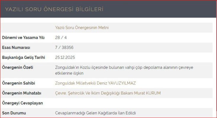Kozlu’daki vahşi çöp depolama alanının tamamen kaldırılması, bölgenin rehabilite edilmesi ve kamuoyuna şeffaf bir takvim açıklanması çağrısında bulunuyoruz. Zonguldak halkı yıllardır süren bu ihmali ve ciddiyetsizliği hak etmiyor. Zonguldak’a eşi benzeri görülmemiş bir rezalet yaşatılıyor. Bu çevre ve sağlık rezaletinin takipçisi olmaya devam edeceğiz.”