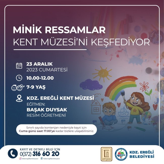 Kdz.Ereğli Belediyesi Kent Müzesi atölyeleri devam ediyor. Bu hafta sonu miniklerimiz eğitmenleri ile birlikte önce müzeyi gezerek, eşyaları keşfedecek, ardından birlikte resim yapacaklar.