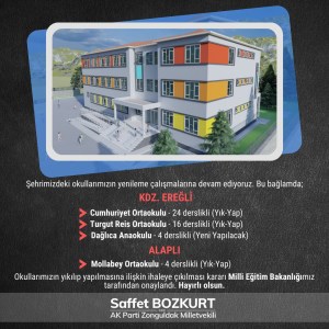 Ak Parti Zonguldak Milletvekili Av. Saffet Bozkurt, ilçedeki bazı okulların yıkılıp yeniden yapılması doğrultusunda Milli Eğitim Bakanlığı tarafından onay verildiğini açıklamasında “Eğitim için yapılan her bir yatırımın ülkemizin geleceğine yapılmış en büyük yatırım olarak değerlendiriyoruz. Şehrimizdeki bazı okullarımızın yıkılıp yeniden yapılmasına ilişkin ihaleye çıkılması kararı Milli Eğitim Bakanlığımız tarafından onaylandı. İlçemiz Kandilli Beldesinde bulunan Kandilli Stadı yapılan yatırımın ardından gece maçlarına ve antrenmanlara da elverişli hale getirildi”