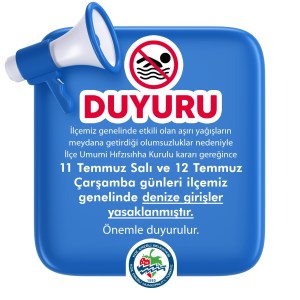İlçemiz genelinde etkili olan aşırı yağışların meydana getirdiği olumsuzluklar nedeniyle 11 Temmuz Salı ve 12 Temmuz Çarşamba günleri denize girişler yasaklanmıştır