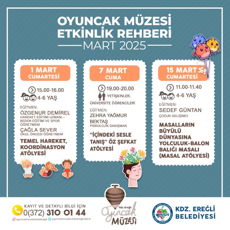 Kdz. Ereğli Belediyesi Oyuncak Müzesi Koordinatörü Melih Can Tanrıkulu, Mart ayı içerisinde gerçekleşecek atölye çalışmalarını açıkladı. Oyuncak Müzesi Atölye çalışmalarına katılmak isteyen veliler 0372 310 01 44 numaralı telefondan ön kayıt yaptırabilirler.