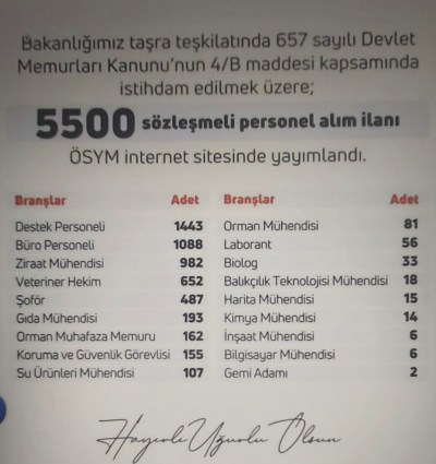 Tarım ve Orman Bakanı İbrahim Yumaklı, bakanlığa 5 bin 500 personel alımı sürecinin başladığını duyurdu. Bakan Yumaklı hangi kadroya kaç kişinin alınacağına dair de bir tablo paylaştı.