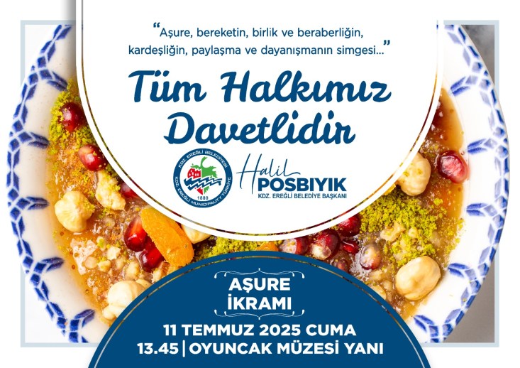 Kdz. Ereğli Belediyesi tarafından Muharrem ayı dolayısıyla 11 Temmuz Cuma günü saat 13.45’de İnönü Parkı’nda vatandaşlara aşure dağıtacak. Belediye Başkanı Halil Posbıyık, “Bereketin, birlik ve beraberliğin, kardeşliğin ve dayanışmanın simgesi aşure paylaşımımıza tüm halkımızı davet ediyorum” dedi.