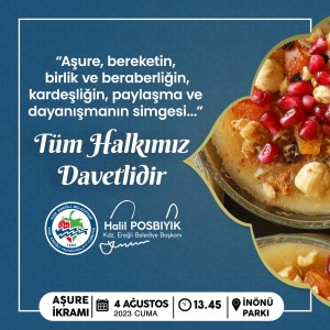04 Ağustos Cuma günü saat 13.45’de İnönü Parkı’nda vatandaşlara aşure dağıtılacak. Belediye Başkanı Halil Posbıyık, “Bereketin, birlik ve beraberliğin, kardeşliğin ve dayanışmanın simgesi aşure paylaşımımıza tüm halkımızı davet ediyorum” dedi.
