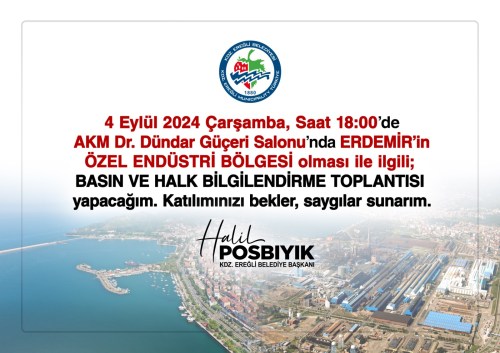 Kdz.Ereğli Belediye Başkanı Halil Posbıyık, Erdemir’in ÖZEL ENDÜSTRİ BÖLGESİ olması ile ilgili, Basın ve Halk Bilgilendirme toplantısı yapacak.