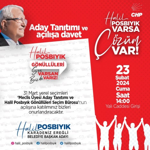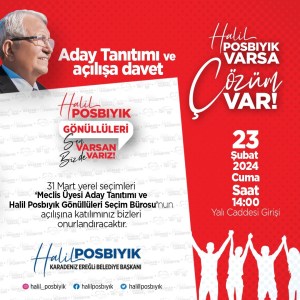 Başkan Posbıyık, yayınladığı mesajda açılış ve tanıtıma tüm Ereğli halkını davet ederek; “Değerli Hemşehrilerim, 23 Şubat 2024 Cuma Saat: 14.00'de; Yalı Caddesi girişindeki 'Posbıyık Gönüllüleri Seçim Büromuzun Açılışı ve Meclis Üyesi Aday Tanıtımı'na katılımınız bizleri onurlandıracaktır. Saygı ve sevgilerimle” dedi.