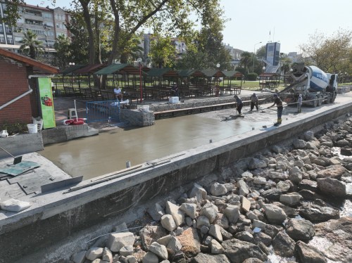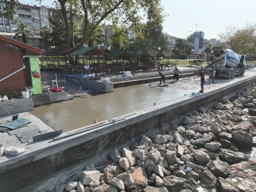Kdz. Ereğli’de 19 Kasım 2023 yaşadığımız büyük felaketin ardından yeniden inşaa edilen ve büyük bir oranda yapılan sahil bandında yürüyüş yollarında renkli baskı beton çalışması yapılıyor.