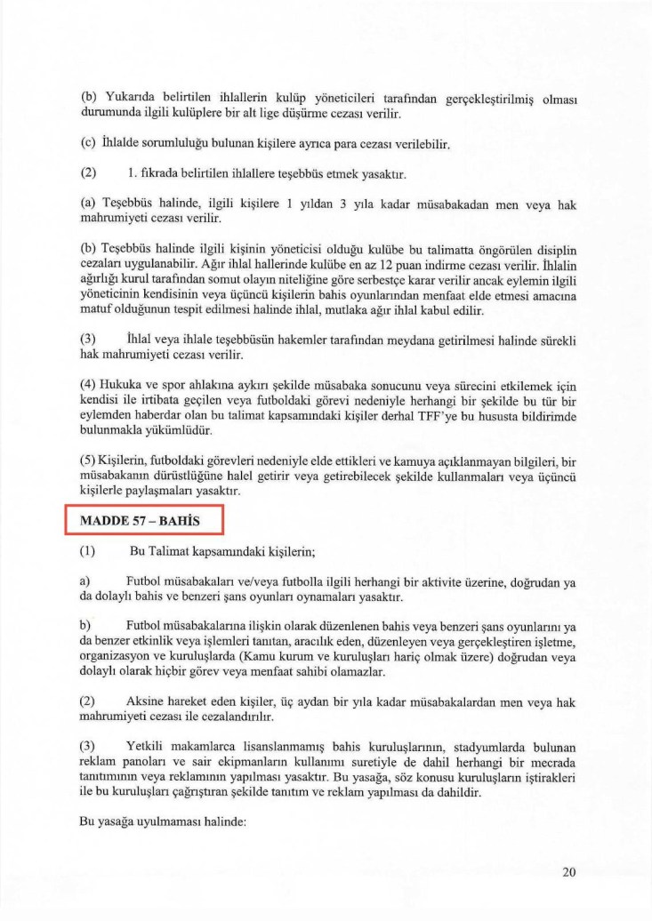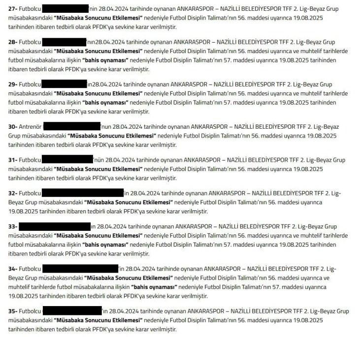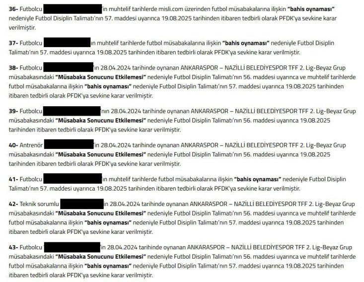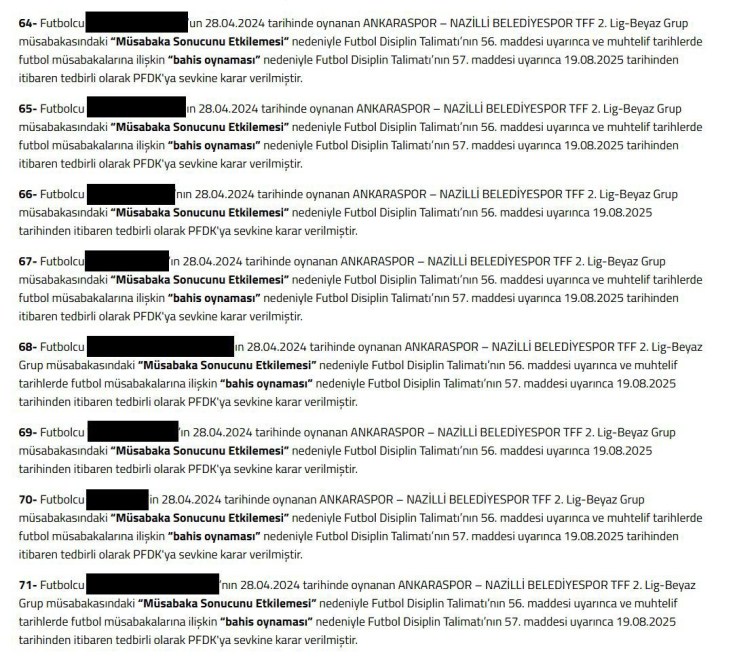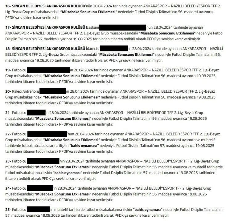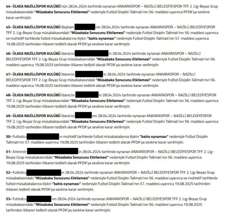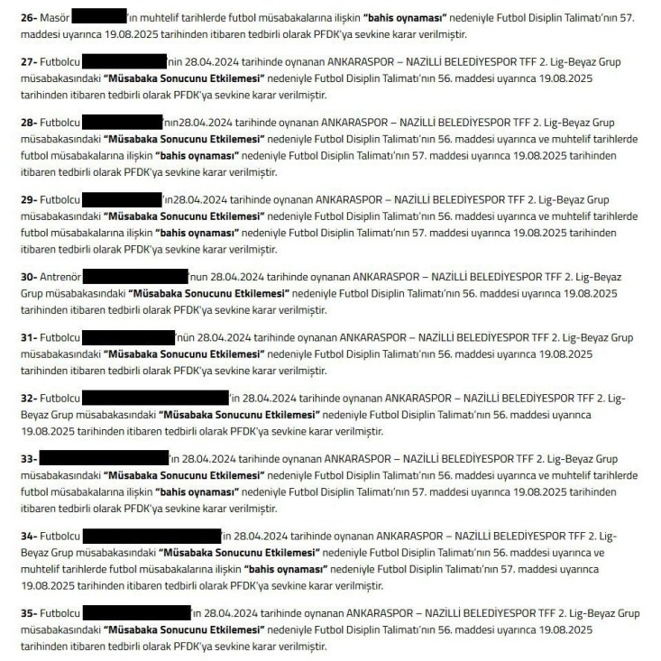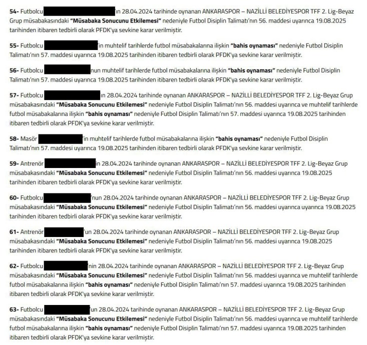 Gelişmelerin ardından TFF Hukuk Müşavirliği, geçtiğimiz günlerde Ankaraspor ve Nazillispor kulüpleriyle birlikte kulüp başkanları, yöneticileri, futbolcuları ve hatta masörleri dahil olmak üzere toplam 54 kişiyi “müsabakanın sonucuna etki etmek ve bahis oynamak” gerekçesiyle Profesyonel Futbol Disiplin Kurulu’na (PFDK) sevk etti.