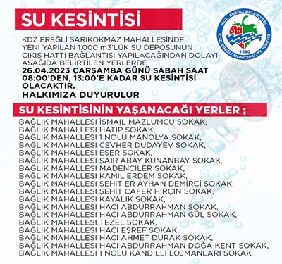 KDZ EREĞLİ İLÇESİNİN SARIKOKMAZ MAHALLESİNDE YENİ YAPILAN 1.000 m3’LÜK SU DEPOSUNUN ÇIKIŞ HATTI BAĞLANTISI YAPILACAĞINDAN DOLAYI AŞAĞIDA BELİRTİLEN YERLERDE 26.04.2023 ÇARŞAMBA GÜNÜ SABAH SAAT 08:00’DEN, 13:00’E KADAR SU KESİNTİSİ OLACAKTIR.