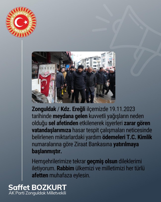 Zonguldak / Kdz. Ereğli ilçemizde 19.11.2023 tarihinde meydana gelen kuvvetli yağışların neden olduğu sel afetinden etkilenerek işyerleri zarar gören vatandaşlarımıza hasar tespit çalışmaları neticesinde belirlenen miktarlardaki yardım ödemeleri T.C. Kimlik numaralarına göre Ziraat Bankasına yatırılmaya başlanmıştır.