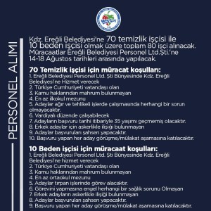 Kdz. Ereğli Belediyesi'ne 70 temizlik işçisi ile 10 beden işçisi olmak üzere toplam 80 işçi alınacak. Müracaatlar Kdz. Ereğli Belediyesi Personel Ltd.Şti.'ne 14-18 Ağustos tarihleri arasında yapılacak.