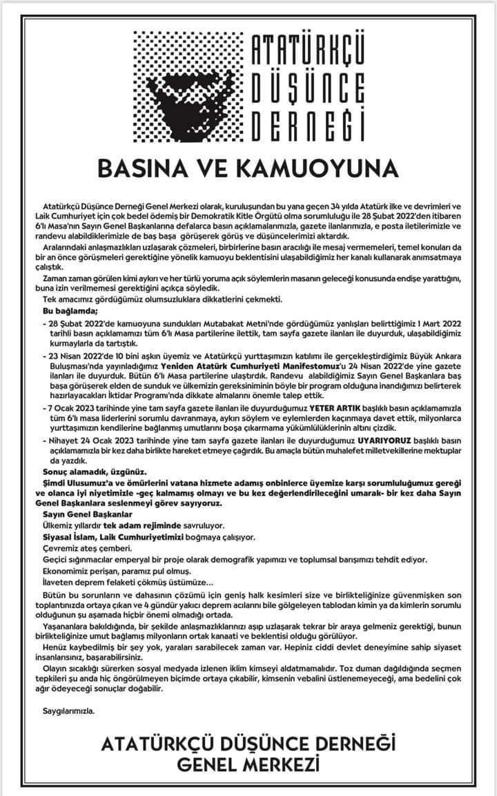 Atatürkçü Düşünce Derneği Genel Merkezi olarak, kuruluşundan bu yana geçen 34 yılda Atatürk ilke ve devrimleri ve Laik Cumhuriyet için çok bedel ödemiş bir Demokratik Kitle Örgütü olma sorumluluğu ile 28 Şubat 2022’den itibaren 6’lı Masa’nın Sayın Genel Başkanlarına defalarca basın açıklamalarımızla, gazete ilanlarımızla, e posta iletilerimizle ve randevu alabildiklerimizle de baş başa görüşerek görüş ve düşüncelerimizi aktardık.