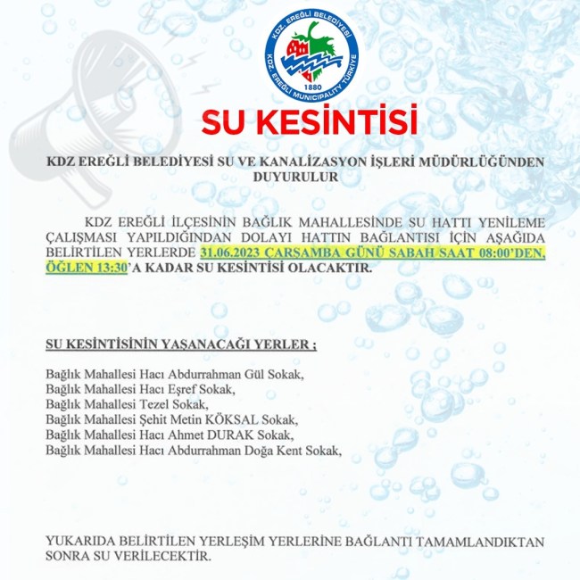 Kdz. Ereğli İlçesi Bağlık Mahallesi’nde su hattı yenileme çalışması yapıldığından dolayı hattın bağlantısı için aşağıda belirtilen yerlerde 31 Mayıs 2023 Çarşamba günü saat 08:00’den öğlen saat 13.30’a kadar su kesintisi olacaktır.