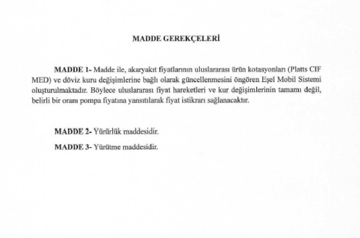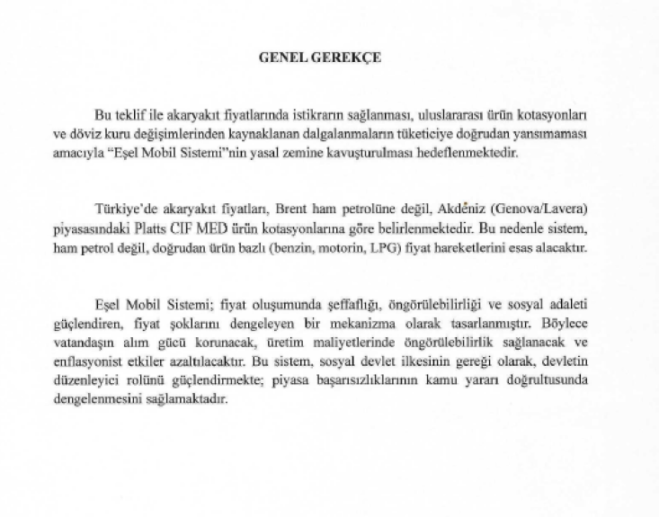 Akaryakıt ürünlerine döviz kuru ve diğer değişimlerden kaynaklanan dalgalanmaların tüketiciye doğrudan yansımaması amacıyla ÖTV’den indirim sağlayan ve vatandaşı fahiş zamdan koruyan Eşel Mobil Sistemi, 22 Aralık 2021 tarihli Resmî Gazete’de yayımlanan 4938 sayılı Cumhurbaşkanı Kararı ile kaldırıldı. Sistem kaldırıldıktan sonra vatandaşlar ani ve sık yaşanan zamlarla karşı karşıya kaldı. Ulaşım, ısınma ve gıda gibi birçok temel alanda kullanılan akaryakıt fiyatlarındaki artış, aile bütçelerine taşınamaz yükler bindirdi. Bugün özellikle dar ve orta gelir gruplarındaki milyonlarca vatandaşımız hayatlarını idame ettiremez hâle geldi. Bu nedenle zamlara karşı bir tampon görevi gören Eşel Mobil Sisteminin yeniden devreye alınması, vatandaşın alım gücünün bir nebze de olsa korunması amacıyla kanun teklifimizi Meclis başkanlığına sunmuş bulunmaktayız.”