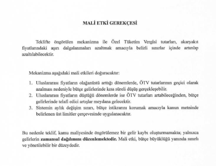 Akaryakıttaki tarihî fiyat artışlarına dikkat çeken Yavuzyılmaz, Akaryakıt fiyatlarındaki artışların tüm sektörlerde zincirleme etki yarattığını ve vatandaşın artık dayanacak gücünün kalmadığını vurgularken, teklifine ilişkin şunları aktardı: