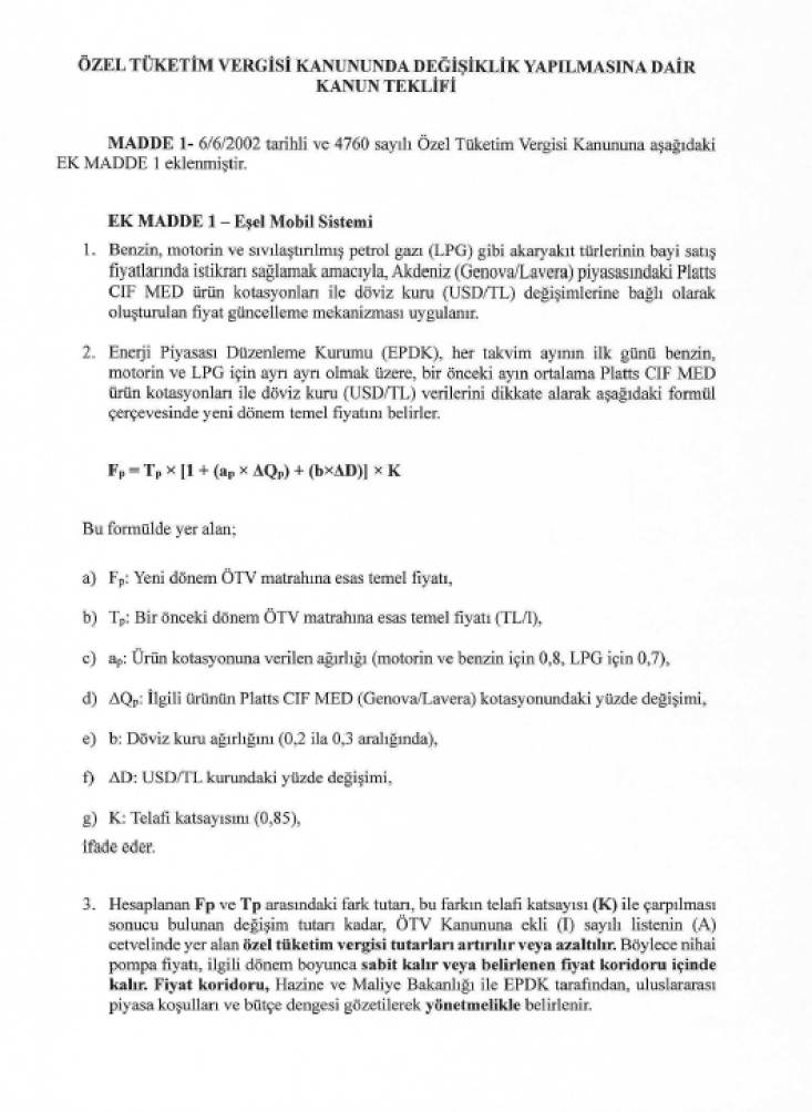 CHP Enerji Politikalarından Sorumlu Genel Başkan Yardımcısı ve Zonguldak Milletvekili Deniz Yavuzyılmaz’ın imzasını taşıyan teklif ile akaryakıt ürünlerine döviz kuru ve diğer değişimlerden kaynaklanan dalgalanmaların tüketiciye doğrudan yansımaması amacıyla ÖTV’den indirim sağlayan ve vatandaşı fahiş zamdan koruyan Eşel Mobil Sistemin yeniden hayata geçirilmesi amaçlanıyor.