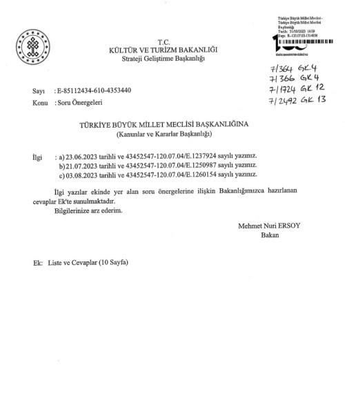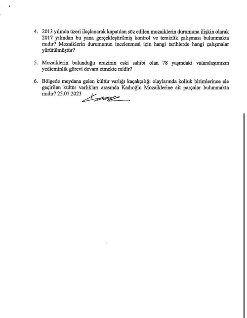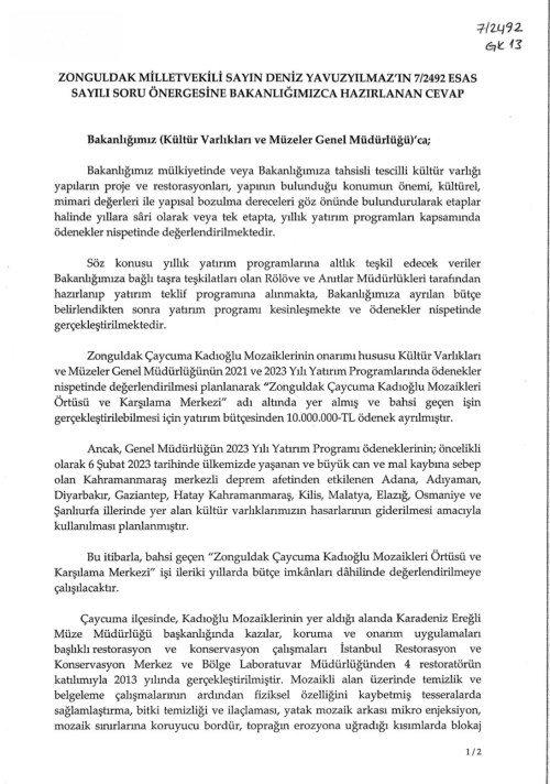 Kültür ve Turizm Bakanı Mehmet Nuri Ersoy imzasını taşıyan yanıtta, mozaiklerin çıkartılması için gereken ödeneklerin Kahramanmaraş merkezli 6 Şubat 2023 depremi nedeniyle iptal edildiği, açıklandı.
