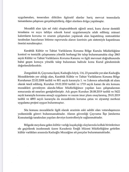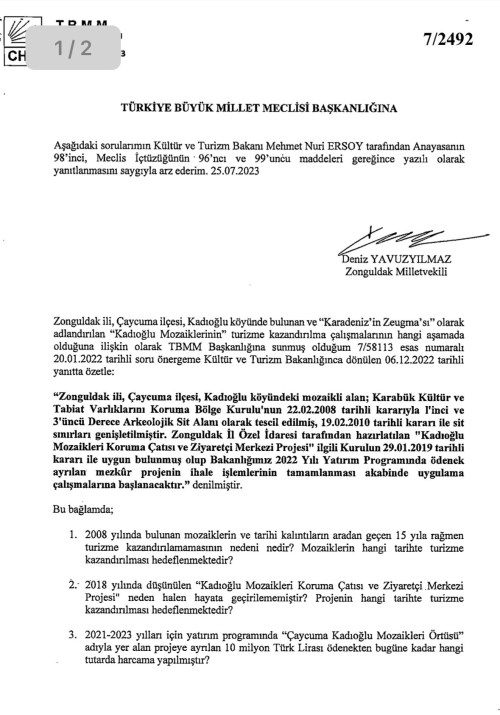 “2008 yılında bulunan Kadıoğlu Mozaikleri arkeoloji dünyasında büyük bir heyecan yaratmıştı. Bölgemizin kalkınması ve tanıtımı açısından son derece kıymetli olan bu buluntular yıllar içinde, türlü bahanelerle turizme kazandırılmadı, bir çizi dahi çakılmadı. Israrlı çağrılarımızın ardında Bakanlık 2019 yılında “Zonguldak Çaycuma Kadıoğlu Mozaikleri Örtüsü ve Karşılama Merkezi" adı altında bir proje hazırlattı ancak bugün bu projenin de hayata geçirilmeden rafa kaldırıldığını öğrenmiş bulunmaktayız. Mozaikleri 16 yıldır turizme kazandırmayan Kültür ve Turizm Bakanlığının bu yıl ki bahanesi de ‘deprem’ oldu. O halde soruyoruz; ‘16 yıldır neredesiniz?’