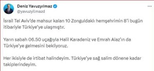 “İsrail Tel Aviv’de mahsur kalan 10 Zonguldaklı hemşehrimin 8’i bugün itibariyle Türkiye’ye ulaşmıştır.