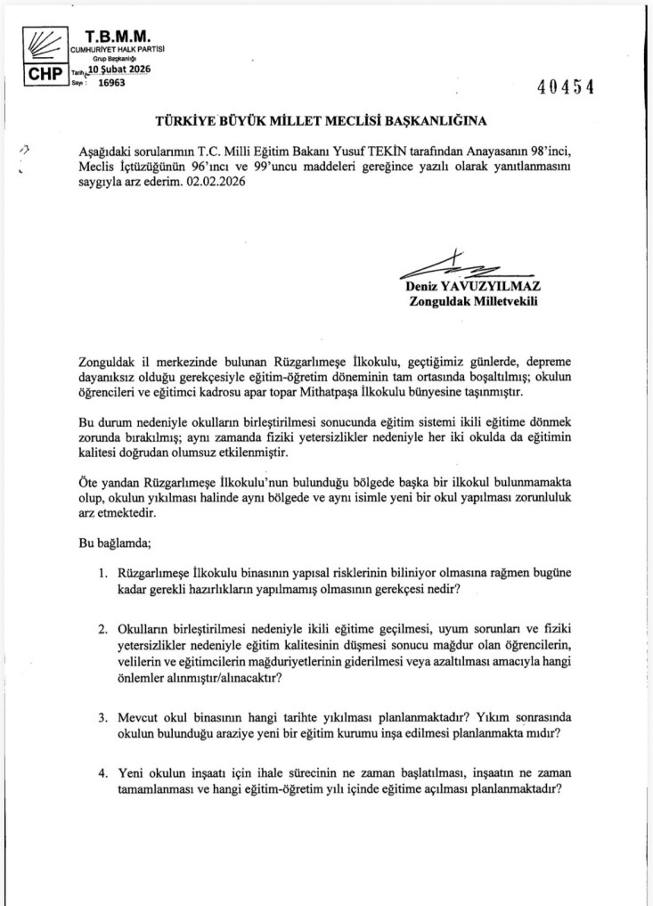 CHP Genel Başkan Yardımcısı ve Zonguldak Milletvekili Deniz Yavuzyılmaz’ın, Zonguldak il merkezinde depreme dayanıksız olduğu gerekçesiyle apar topar boşaltılan Rüzgarlımeşe İlköğretim Okulu’nun akıbetine ilişkin verdiği soru önergesi yanıtlandı.