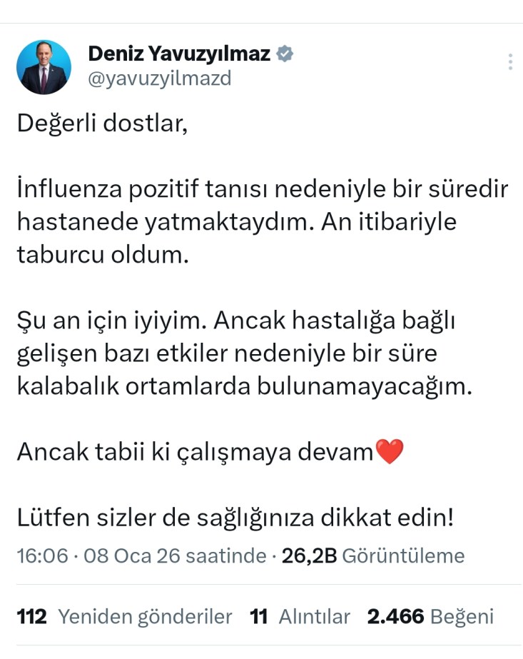 Cumhuriyet Halk Partisi (CHP) Kamu Denetiminden ve Yolsuzluklarla Mücadeleden Sorumlu Genel Başkan Yardımcısı ve Zonguldak Milletvekili Deniz Yavuzyılmaz, influenza nedeniyle bir süredir hastanede tedavi görüyordu. Yavuzyılmaz, tedavisinin ardından taburcu edildiğini duyurdu.