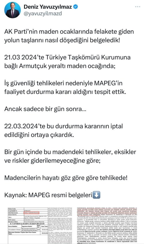 MAPEG tarafından 22.03.2024 tarihinde verilen uyarının madendeki tehlikeler, eksikler ve riskler giderilemeden sadece bir gün sonra kaldırıldığına dikkat çeken Deniz Yavuzyılmaz “Madencilerin hayatı göz göre göre tehlikeye atılıyor!” diyerek yaptığı paylaşımında şunları söyledi: