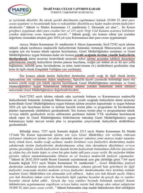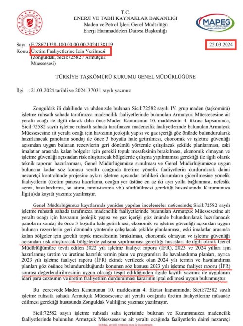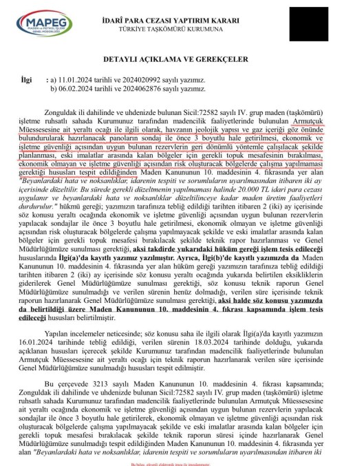 Enerji ve Tabii Kaynaklar Bakanlığına bağlı bir kuruluş olan Maden ve Petrol İşleri Genel Müdürlüğü (MAPEG) tarafından müesseseye verilen uyarı belgesini sosyal medya hesabı X üzerinden kamuoyu ile paylaşan Yavuzyılmaz, Armutçuk yer altı maden ocağında işletme açısından tespit edilen tehlikeli durumların bir an önce giderilerek, işçiler için güvenli çalışma ortamının acilen sağlanması gerektiğini söyledi.