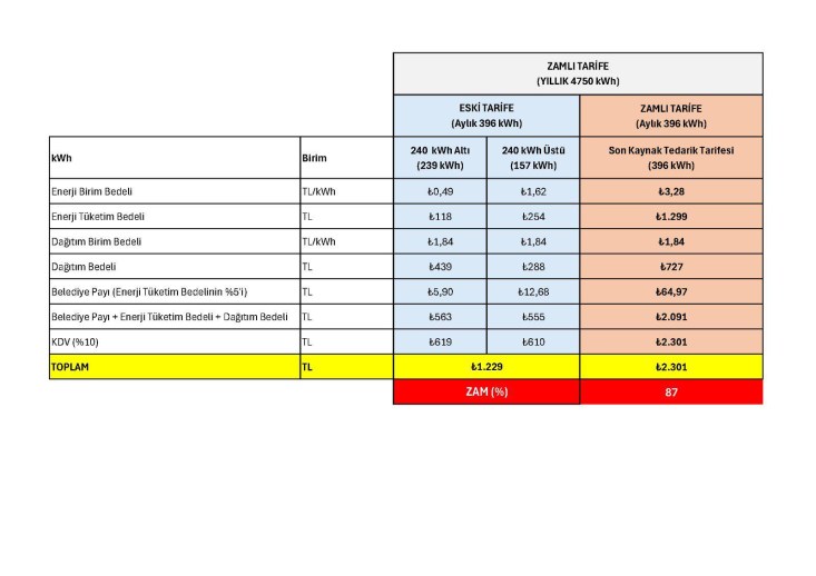 “Aylık 333 kWh elektrik tüketen bir abonenin 984 TL gelen faturası, 2026’da 1.935 TL’ye yükselecek. Yani yapılacak zam oranı %97. 1.148 TL’lik fatura 2.179 TL’ye, 1.229 TL’lik fatura 2.301 TL’ye çıkacak.”
