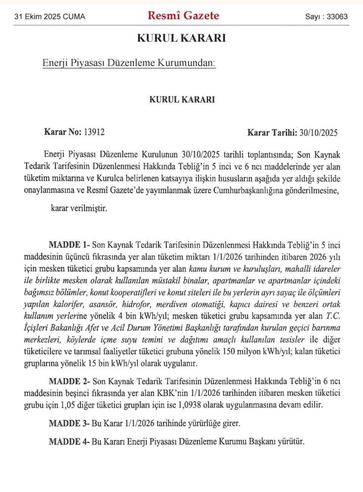 Enerji Piyasası Düzenleme Kurumu’nun (EPDK) 31 Ekim 2025 tarihli Resmî Gazete’de yayımlanan kararıyla, apartman ve sitelerdeki ortak kullanım alanlarının elektrik tarifesi değiştirildi. Artık asansör, hidrofor, merdiven otomatiği ve kapıcı dairesi gibi ortak sayaçların yıllık tüketimi 4 bin kWh’yi aşarsa, bu alanlar konut tarifesinden çıkarılarak ticarethane tarifesine alınacak. Önceki limit 5 bin kWh idi. Yeni uygulama 1 Ocak 2026 tarihinde yürürlüğe girecek.