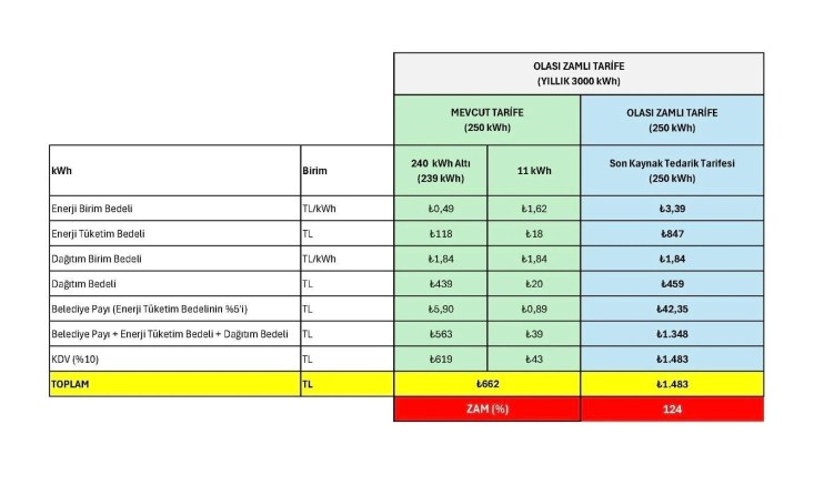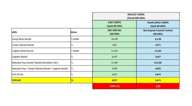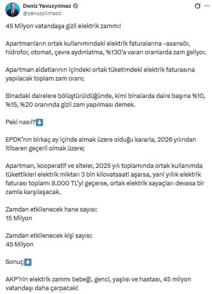 Yavuzyılmaz, ortak kullanım alanlarının elektrik faturalarında yüzde 130’a varan zam olabileceğini belirterek, “Bu düzenleme yürürlüğe girerse yaklaşık 45 milyon vatandaş olumsuz etkilenecek” dedi.