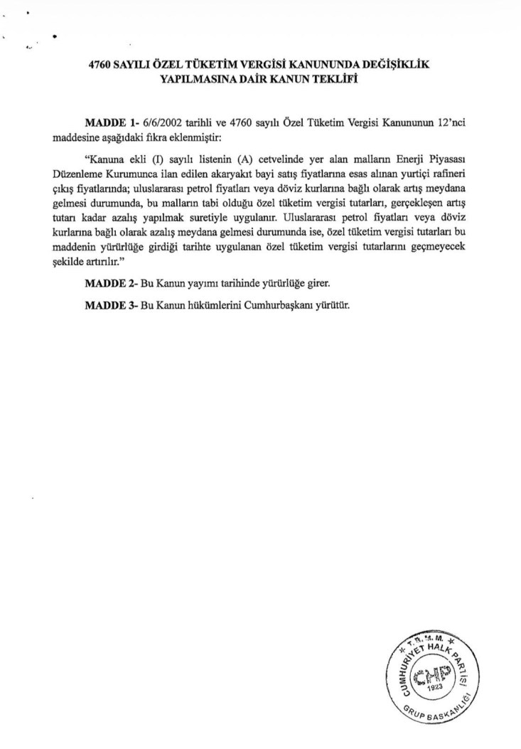 CHP Genel Başkan Yardımcısı ve Zonguldak Milletvekili Yavuzyılmaz, geçtiğimiz günlerde TBMM Başkanlığı’na sunduğu kanun teklifinde, akaryakıt fiyatlarındaki artışların KDV ve ÖTV’de yapılacak otomatik indirim mekanizmasıyla dengelenmesini istemişti. Yavuzyılmaz, bugün itibarıyla teklifin acilen Meclis Genel Kurulu gündemine alınmasını talep etti.