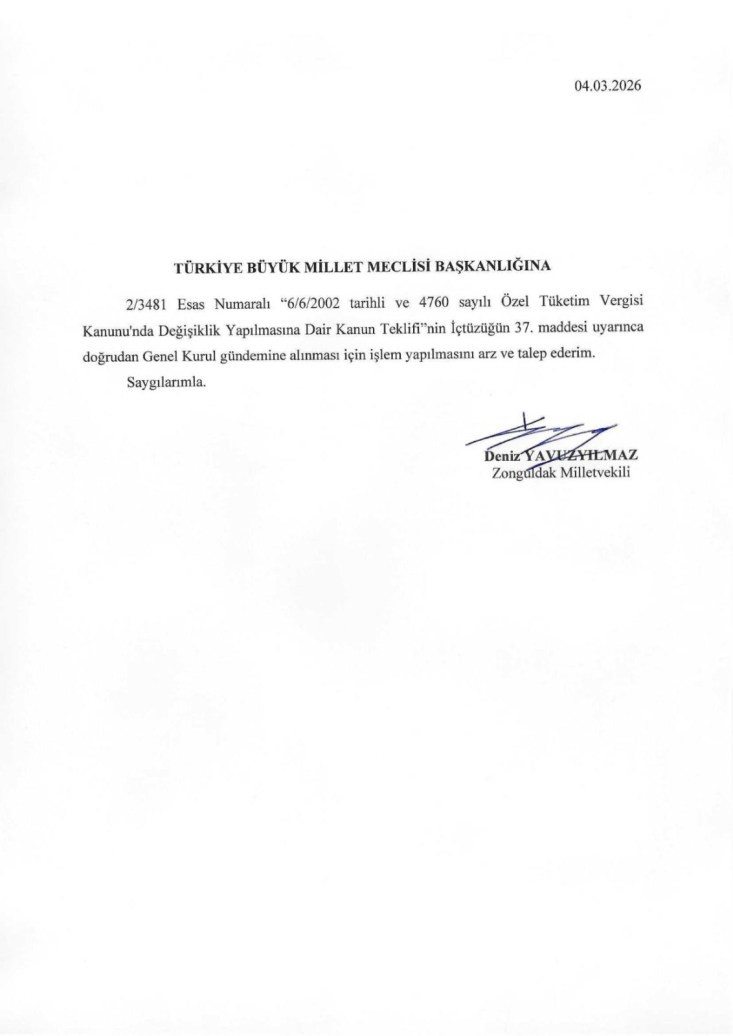 Milletvekili, TBMM İçtüzüğü’nün 37. maddesine dayanarak teklifin doğrudan Genel Kurul gündemine alınması için dilekçe verdi. Başvurunun ardından, akaryakıtta otomatik vergi indirimi mekanizmasını içeren düzenlemenin kısa süre içinde Genel Kurul’a getirilerek oylanması bekleniyor.