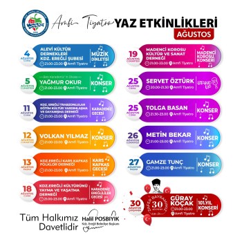 Kdz. Ereğli Belediyesi Kültür ve Sosyal İşler Müdürlüğü’nün Amfi Tiyatro’da düzenlediği konser ve gösterilerden oluşan yaz etkinliklerinin Ağustos ayı programı açıklandı. 4 Ağustos Cuma günü Alevi Kültür Dernekleri’nin müzik dinletisiyle başlayacak etkinlikler kapsamında Kdz. Ereğlililer gecesi, Karadeniz gecesi ve Kars Kafkas gecesi düzenlenecek. Ayrıca Batı Karadeniz’in divası Yağmur Okur, Madenci Korosu, Belediye Müzik ekibi, Tolga Basan, Metin Bekar, Gamze Tunç ve Güray Koçak konser verecek, Servet Öztürk Stand Up gösterisinde bulunacak.