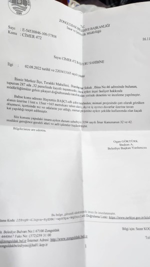 Terakki Mahallesinde bir vatandaş Yeşil Cami üzerine kaçak kat çıkılmasını CİMER’e bildiriyor. CİMER bu konuyu Zonguldak Belediyesine havale ediyor ve gereğinin yapılmasını istiyor..