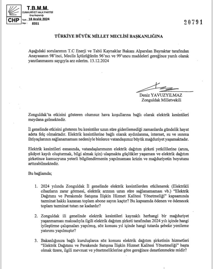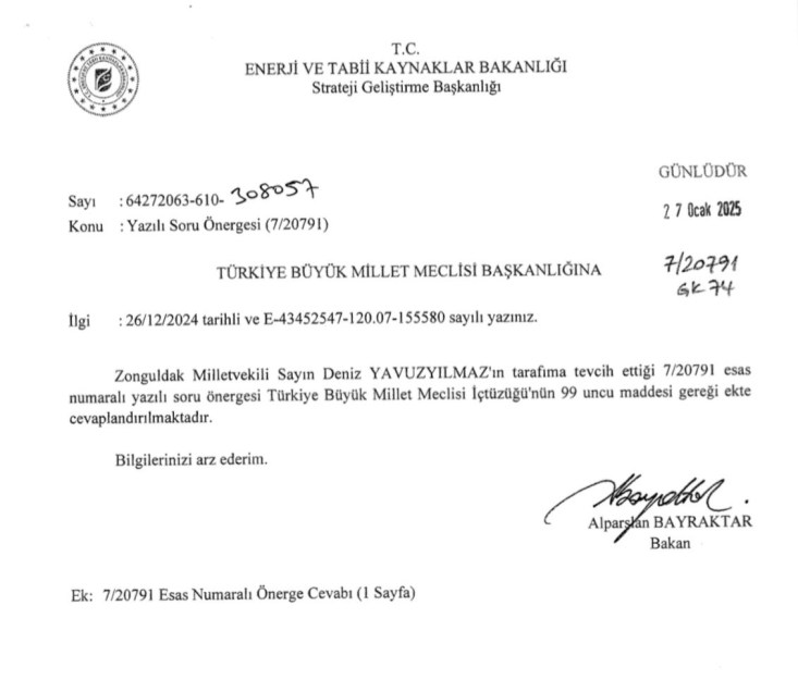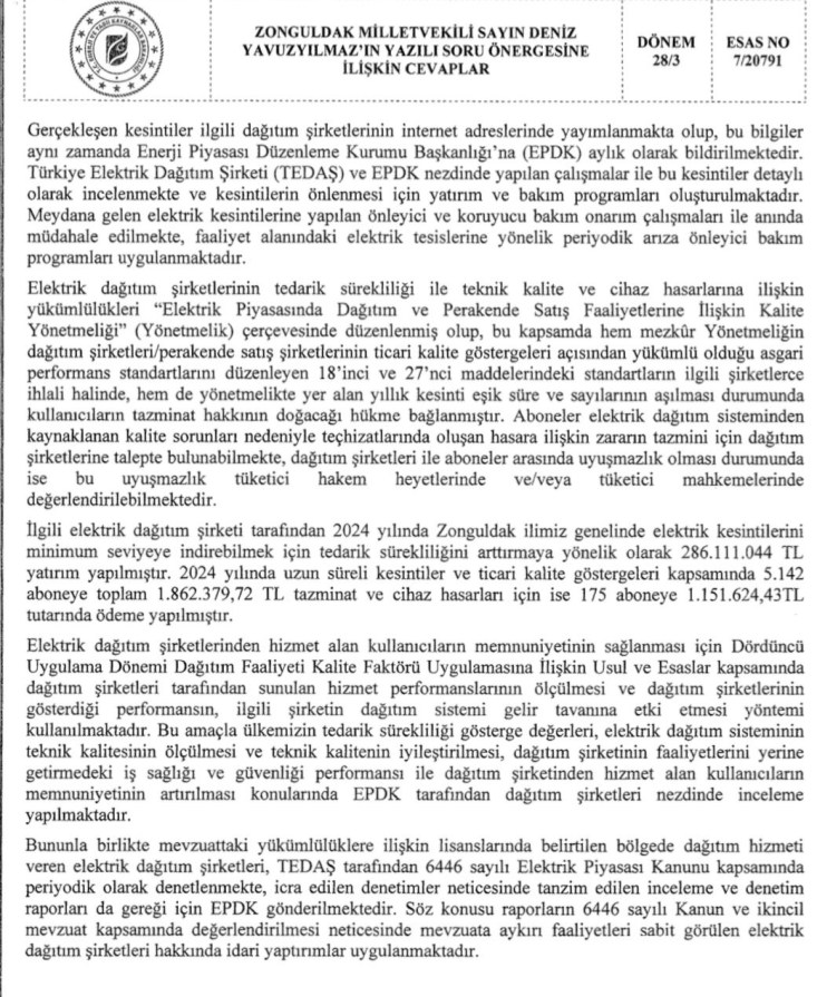 Yavuzyılmaz, söz konusu dağıtım şirketi tarafından 2024 yılında hangi iyileştirme çalışmalarının ve hangi tutarda şebeke yenileme yatırımı yapıldığı, ayrıca kesintiler nedeniyle Zonguldak halkına hangi tutarda tazminat ödendiği sorularına yanıtlar ararken, Milletvekilinin önergesi Enerji ve Tabii Kaynaklar Bakanlığı tarafından 27 Ocak 2025 tarihinde yanıtlandı.